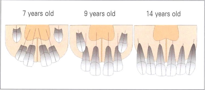 아기의 금이 간 앞니는 생각보다 흔합니다. 위 앞니는 처음 맹출할 때 열려 있는 것처럼 보이지만 앞니 옆으로 치아가 자라면서 앞니 사이의 간격이 점차 좁아질 수 있습니다. 또한 아기 때 맹출하는 유치의 경우 치아 사이에 약간의 공간이 있습니다. 나중에 나오는 영구치가 유치보다 크기 때문입니다. 초기에 유치가 빽빽하게 들어 오면 영구치가 고르지 않고 비뚤어질 가능성이 커집니다. 이 경우 영구치가 자랄 공간이 충분하지 않고, 대신 영구치가 맹출할 때 빽빽하게 보일 수 있습니다.