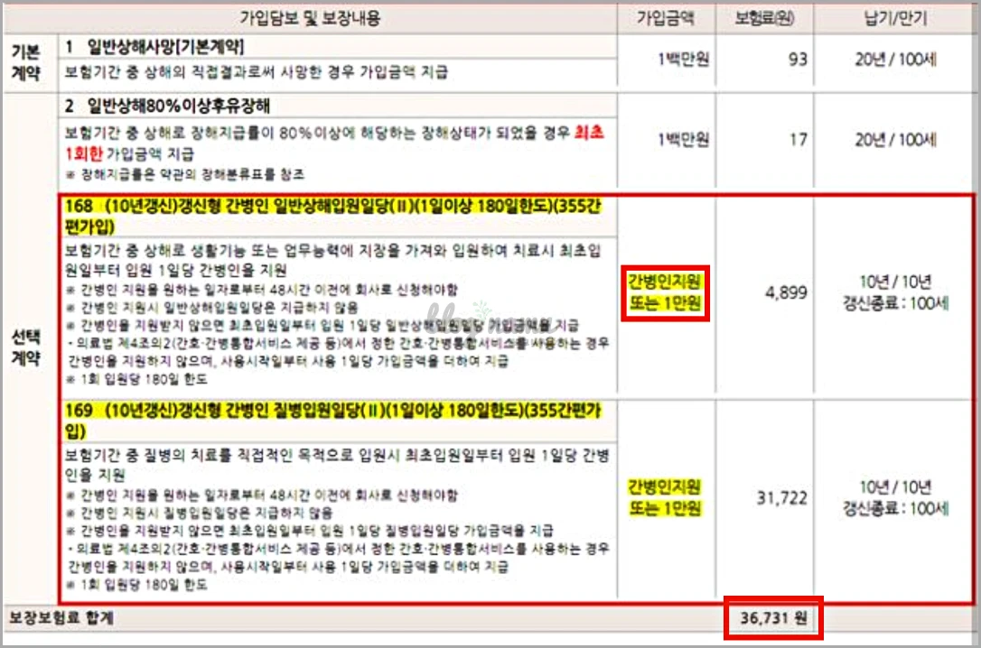 종합병원 1인실은 총 60만원, 종합병원 1인실은 20만원, 혼잡한 병원이나 의원 입원은 1일 15만원, 요양병원 입원은 1일 5만원, 통합간호*돌봄 서비스는 3만원, 총 45,137원!(간병비는 만기까지 5년마다 10%씩 인상 예: 16.5만원 18만원…) 그 밖에 혼잡방법이 하나 더 있는데, 새로 나온 혼잡형보험인데, 보통 20년납, 100년 무갱신형을 많이 쓰는데, 20년 지나면 혼잡형 간병비가 더블 혼잡형으로 엄청나게 늘어납니다. 예) 병원 간병비 15만원, 가입 20년 후 2회 납부하는 간병비 30만원(100세 만기까지 동일 금액 납부, 미갱신 보험료 없이 가능) 간병보험료가 매달 얼마인지 정리해보자면… 앞으로는 노인인구 증가에 따라 간병비가 실제 의료비 등 생계형 보험이 될 것이다. 나이가 들수록 보험료가 오르고, 병력이 쌓일수록 신청이 거부될 가능성이 높아지므로 가능하다면 은퇴 전 월 수만 원 정도로 몸을 보호해주는 장기요양보험을 알아보는 것이 좋다.
