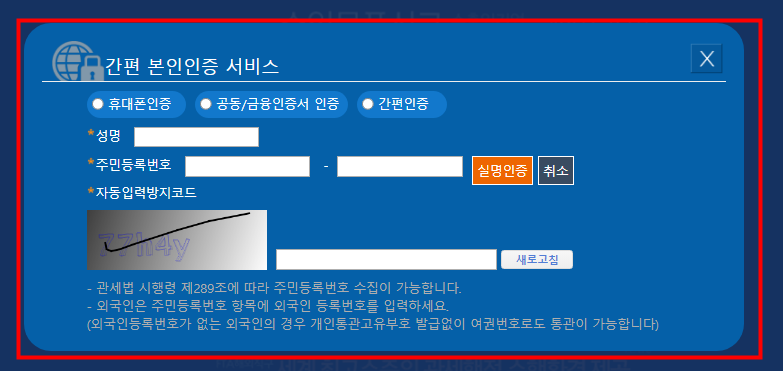 본인의 인증방법(휴대폰인증, 공인인증서인증, 간편인증)에 따라 실명인증 및 본인인증 후 개인통관고유부호 조회를 위해 이름, 주민등록번호, 자동방어코드를 입력하세요.