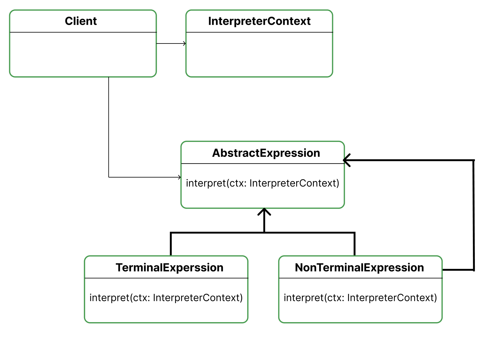 • 추상 구문 트리 인터페이스(AbstractExpression): 우리가 표현하고 있는 문법을 나타냅니다. 컨텍스트가 포함되어 있습니다.